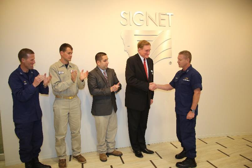 Signet supported the Coast Guard on three separate occasions during this time, demonstrating their proactive engagement and cooperative spirit. During and after Hurricane Harvey, Mr. Snyder provided Sector/Air Station Corpus Christi with tugs to respond to storm damaged vessels and reconstitute the port. Additionally, on October 20, 2017, Mr. Snyder and the Signet Ingleside Team provided tremendous support with firefighting application to extinguish a fire onboard Barge No. 255, an effort that helped settle the fire within ten minutes. Finally, Mr. Snyder entered into a mutual training agreement with Coast Guard Sector/Air Station Corpus Christi on December 22, 2017 to build knowledge and experience for both crews in advanced Search and Rescue operations for fixed and rotary wing aircraft.