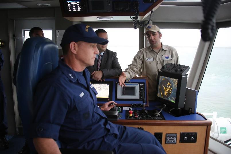 RADM Thomas onboard SIGNET ARCTURUS navigating the LaQuinta Channel as Captain Taylor and Joshua Johnson demonstrate technologically advanced equipment in the wheelhouse
